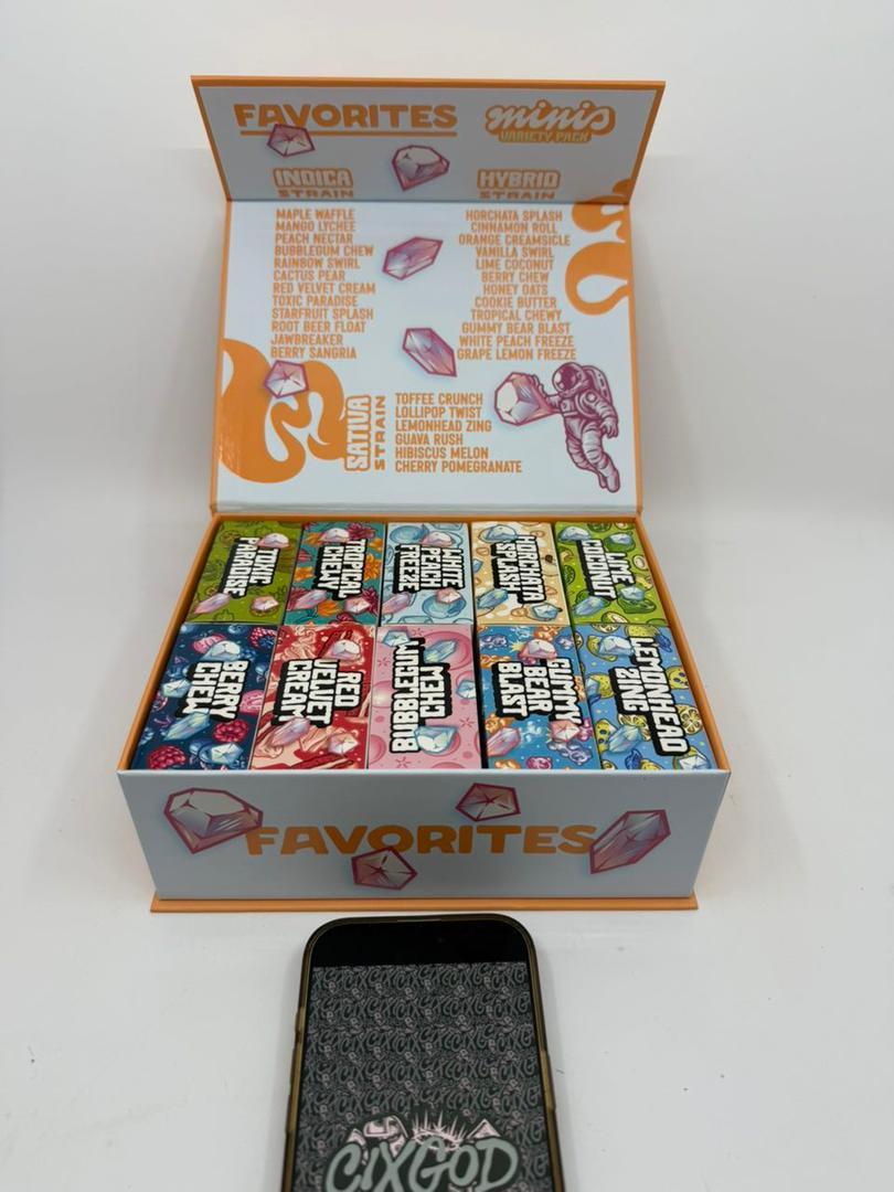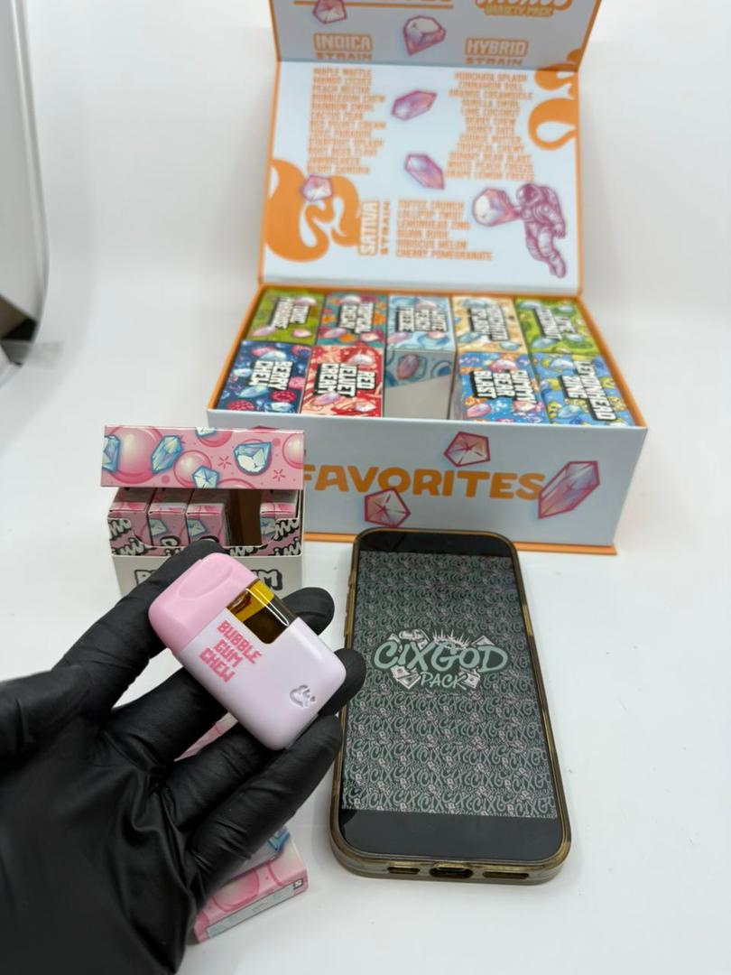 raspberry rush (indica), wild cherry (indica), peach parfait (indica), blue zkittlez (indica), red blow pop (indica), waffles (indica), fruit bowl (indica), pbj (sativa), atomic bomb pop (sativa), extreme sour (sativa), cinnamon milk (sativa), white gushers (sativa), dabbalicious (hybrid), honey comb (hybrid), cranberry juice (hybrid), caramel apples (hybrid), lychee smash (hybrid), starberries (hybrid), velvet smores (hybrid), 5pk(mixed flavors), 10pk(mixed flavors), 25pk(mixed flavors), 50pk(mixed flavors), 100pk(mixed flavors)